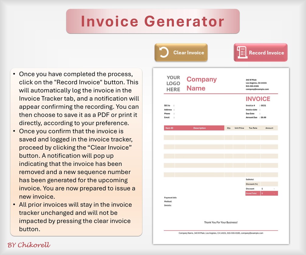 * REAL AUTOMATION: Unique VBA Macros! Effortlessly "Record Invoice" to log it permanently in the Tracker *and* "Clear Invoice" to reset the generator with the next number auto-assigned! (No more copy-pasting or manual logging!).