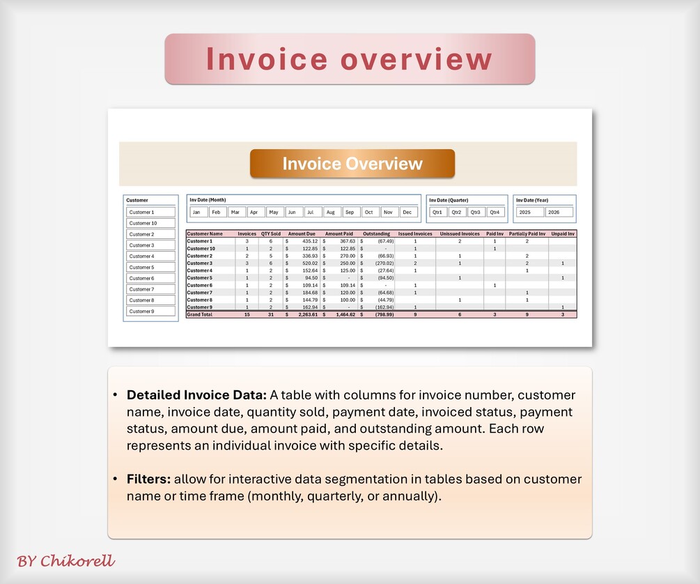 * ALL-IN-ONE SOLUTION: Combines a powerful Invoice Generator, a detailed Invoice Tracker, a filterable Invoice Overview, and an insightful Invoice Dashboard in one seamless Excel workbook.