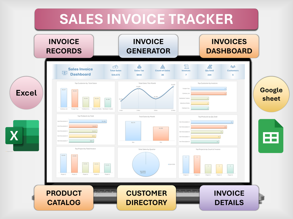 Sales Invoice Tracker Excel & Google Spreadsheet Template | Generator, Customer, Product Management Automated Dashboard