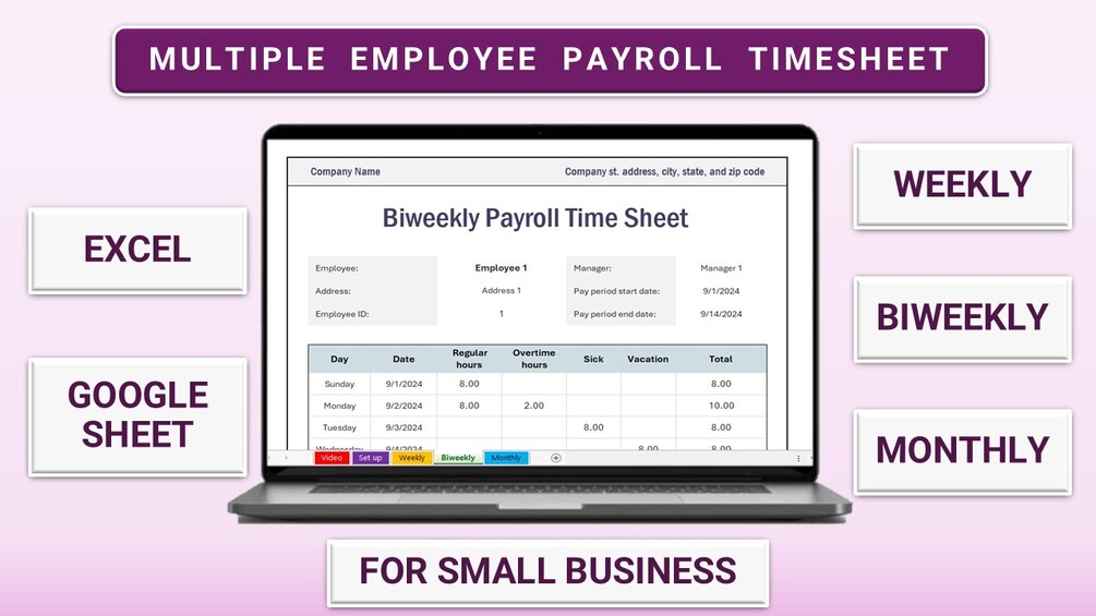 Simple Employee Payroll Timesheet Tracker | Excel & Google Spreadsheet Template | Weekly, Biweekly, Monthly | Automated Payroll calculations