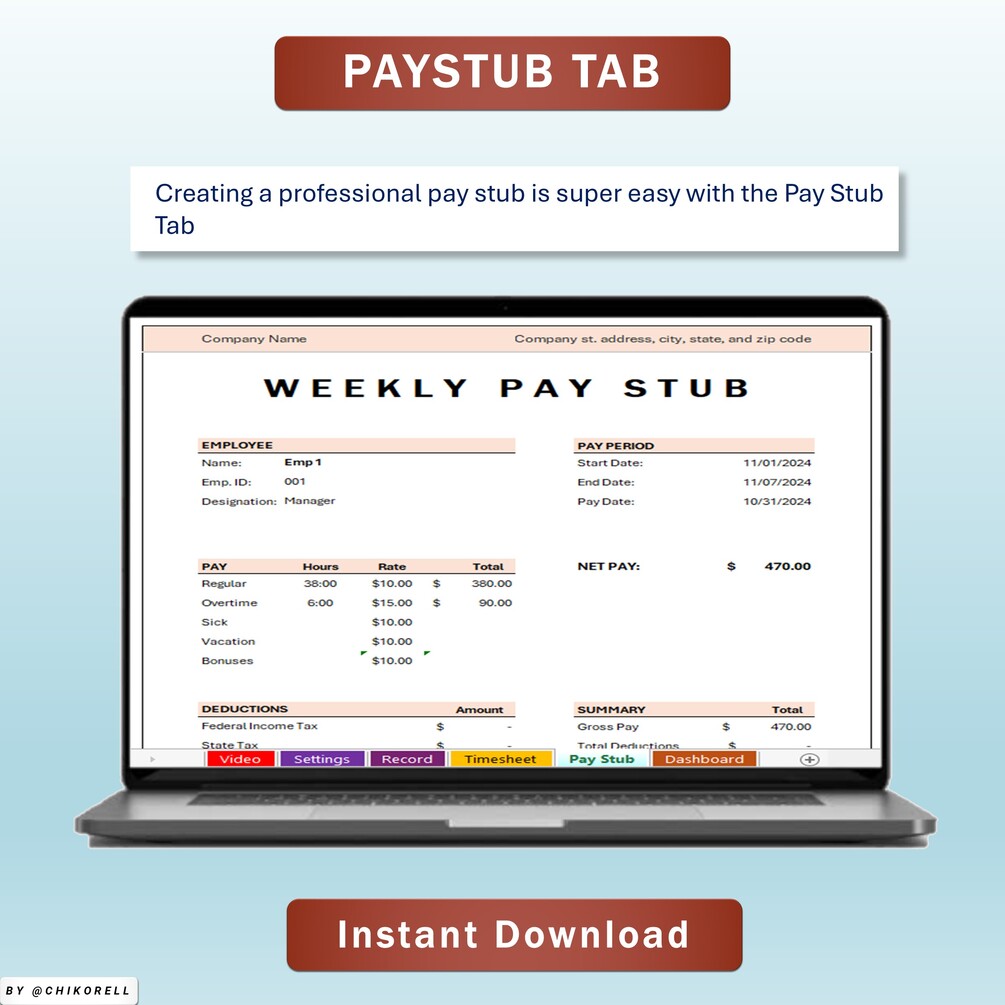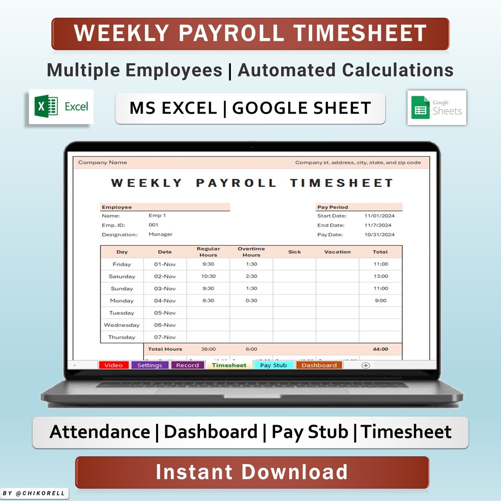 Weekly Payroll Timesheet Tracker | Excel & Google Spreadsheet Template | Overtime Calculator, Pay Stub, Employee Attendance and Dashboard